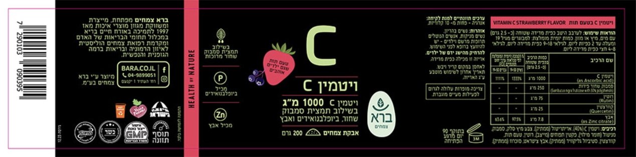 קומפלקס ויטמין C עוצמתי (1000 מ"ג) בתוספת סמבוק שחור, אבץ, קוורצטין ורוטין. אבקה בטעם תות.